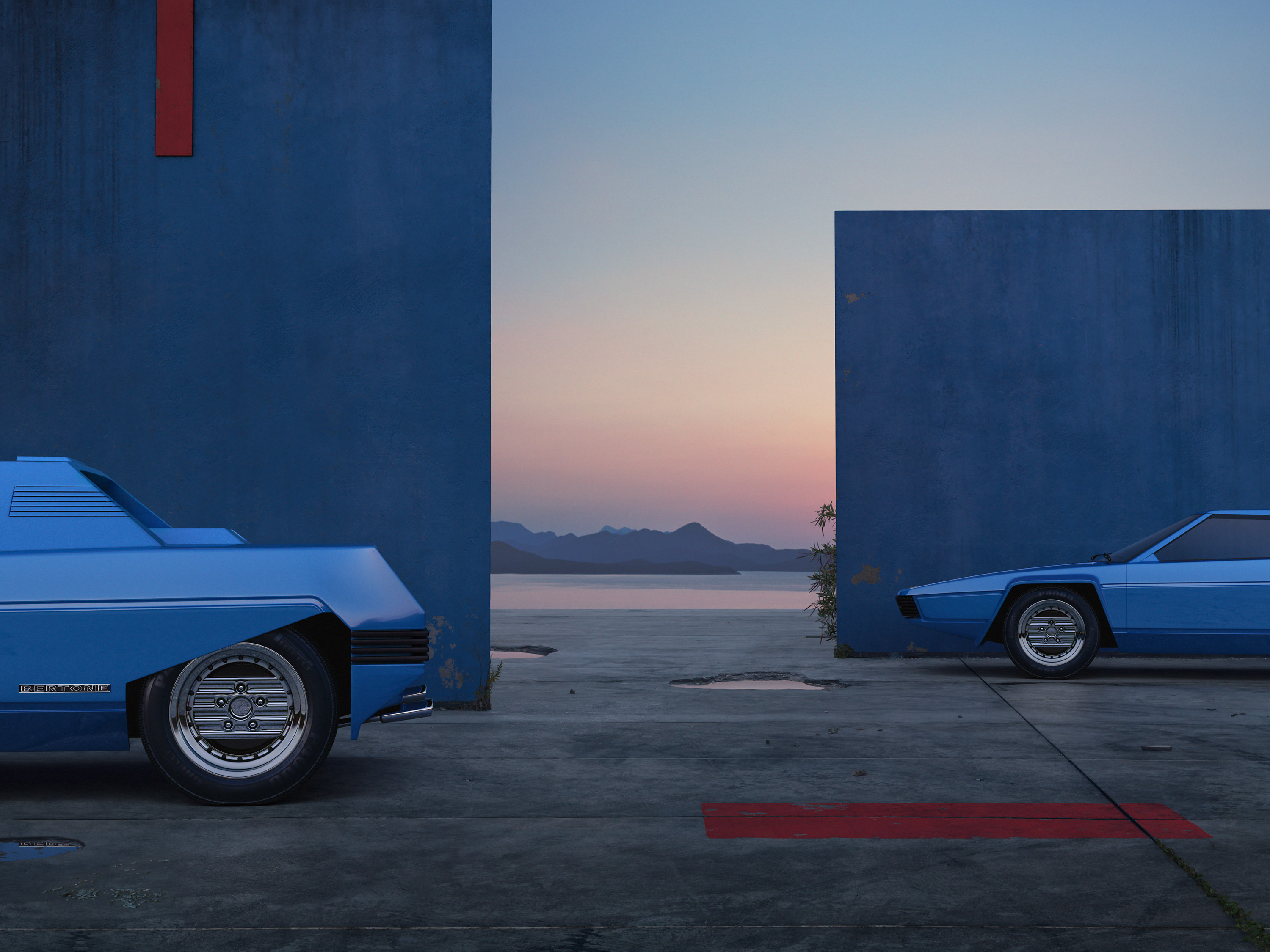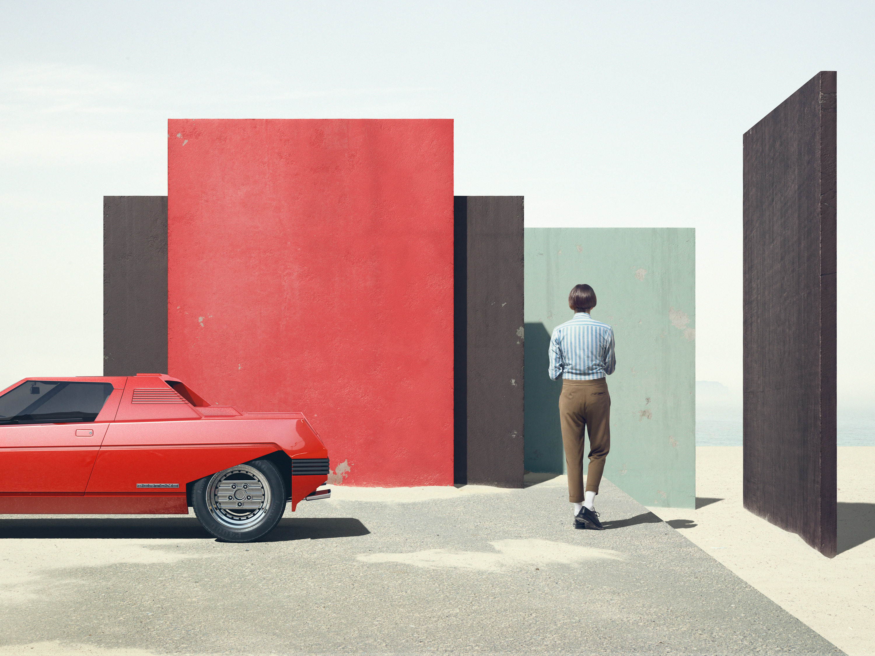 I've dreamt up this surrealistic and graphic world featuring mysterious monuments, the legendary ferrari rainbow and it's furious drivers.